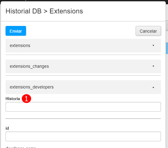 Se desplegará un formulario con todas las tablas y campos de la extensión. A continuación, mostramos por ejemplo la extensión extensions: