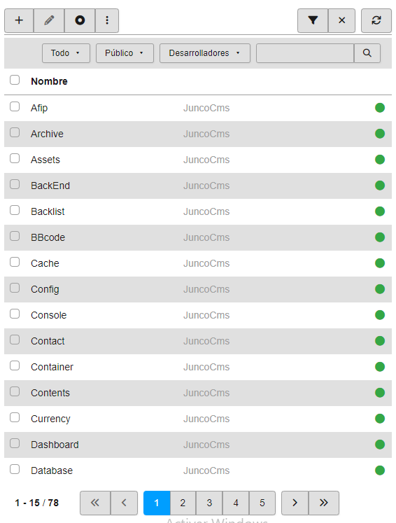 Combina una tabla, donde se listan los registros, con un filtro de búsquedas y botones de acción y de paginación.