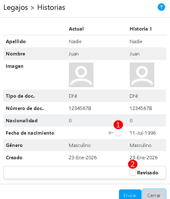 La tabla contiene los datos actuales y una lista de historias. Si un dato actual no coincide con la última historia, aparecerá una casilla para confirmar la modificación del dato actual (1).