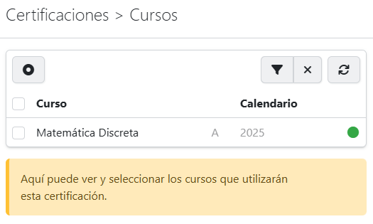 En esta sección se asignarán todos los cursos que utilizarán una certificación. No hay límites de calendarios.